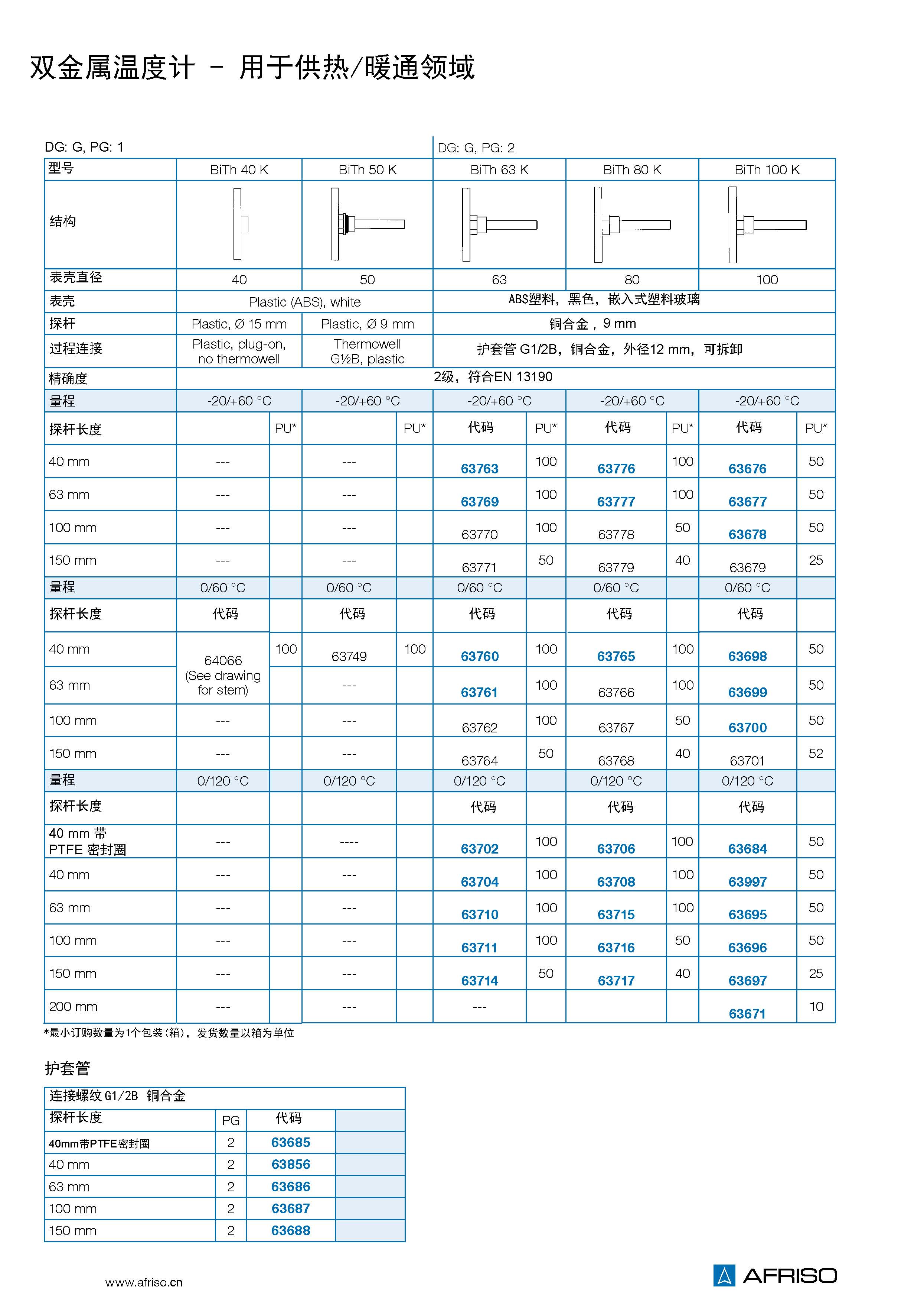 探桿塑料,銅合金或鋁,Ф9mm; 護套管,銅合金,G1/2B,可拆卸; 或探桿長40mm,帶PTFE密封圈 |