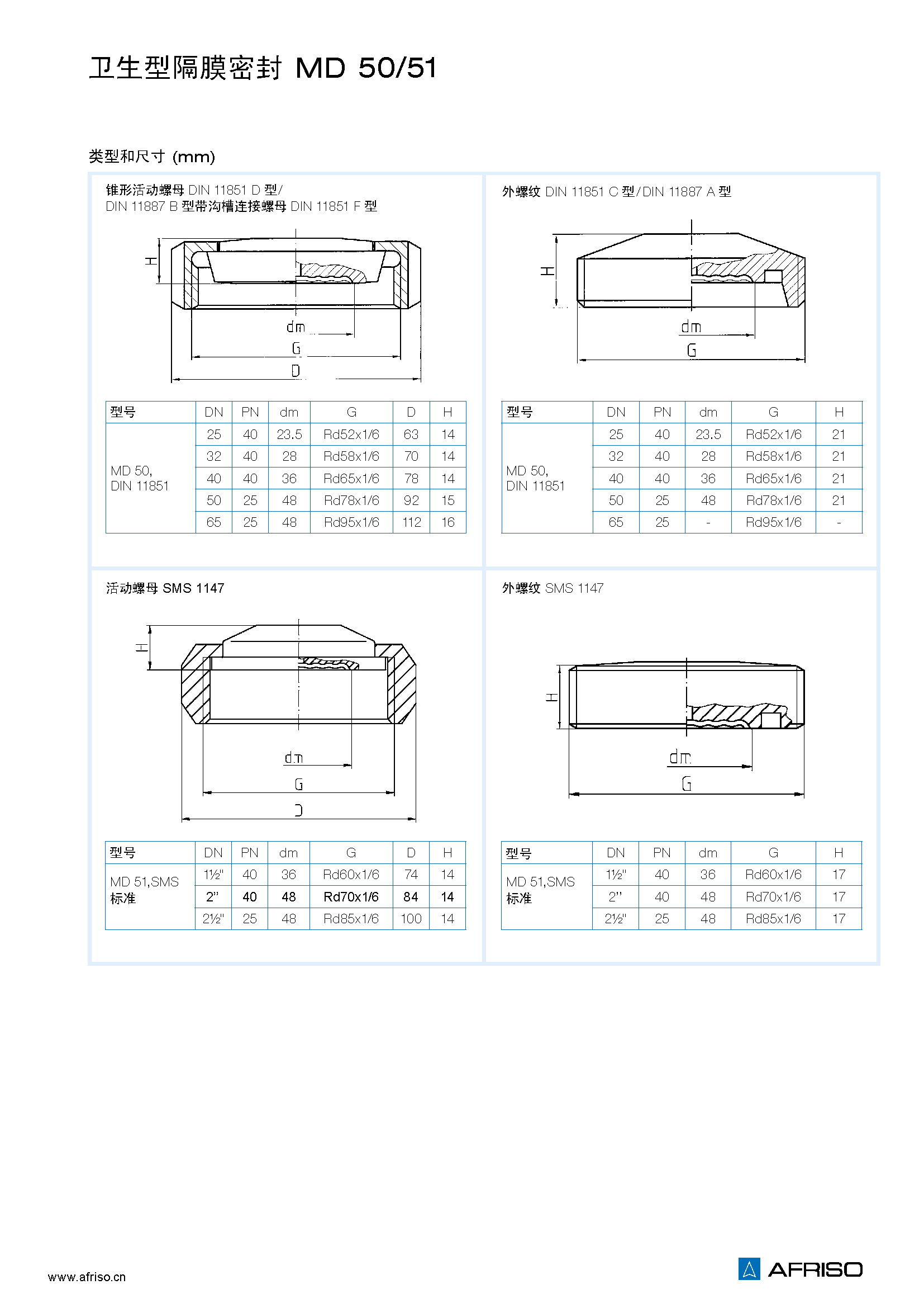 MD50:DIN 11851/11887 DN 25到DN 65 MD51:SMS 1147 1"到2?" |