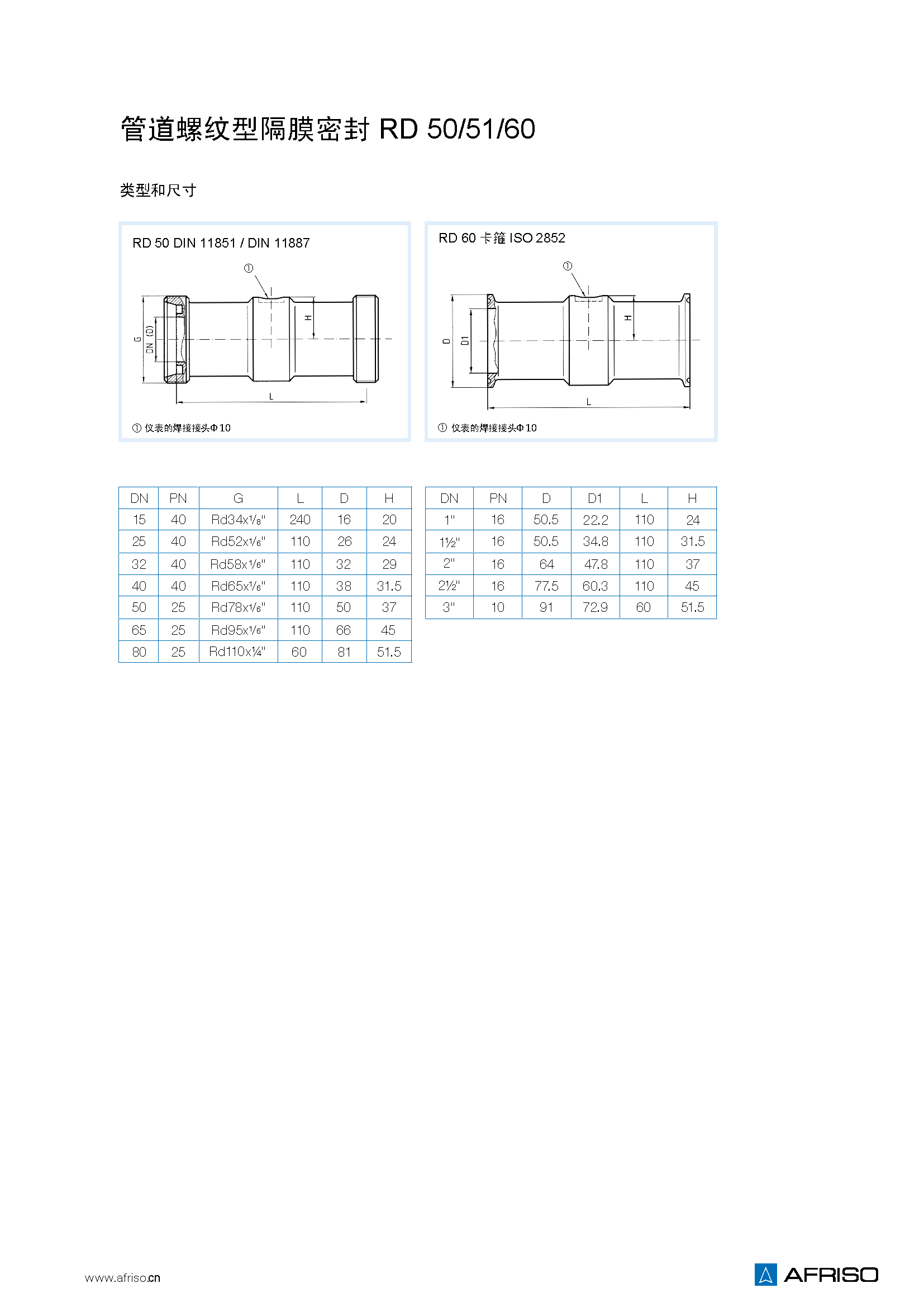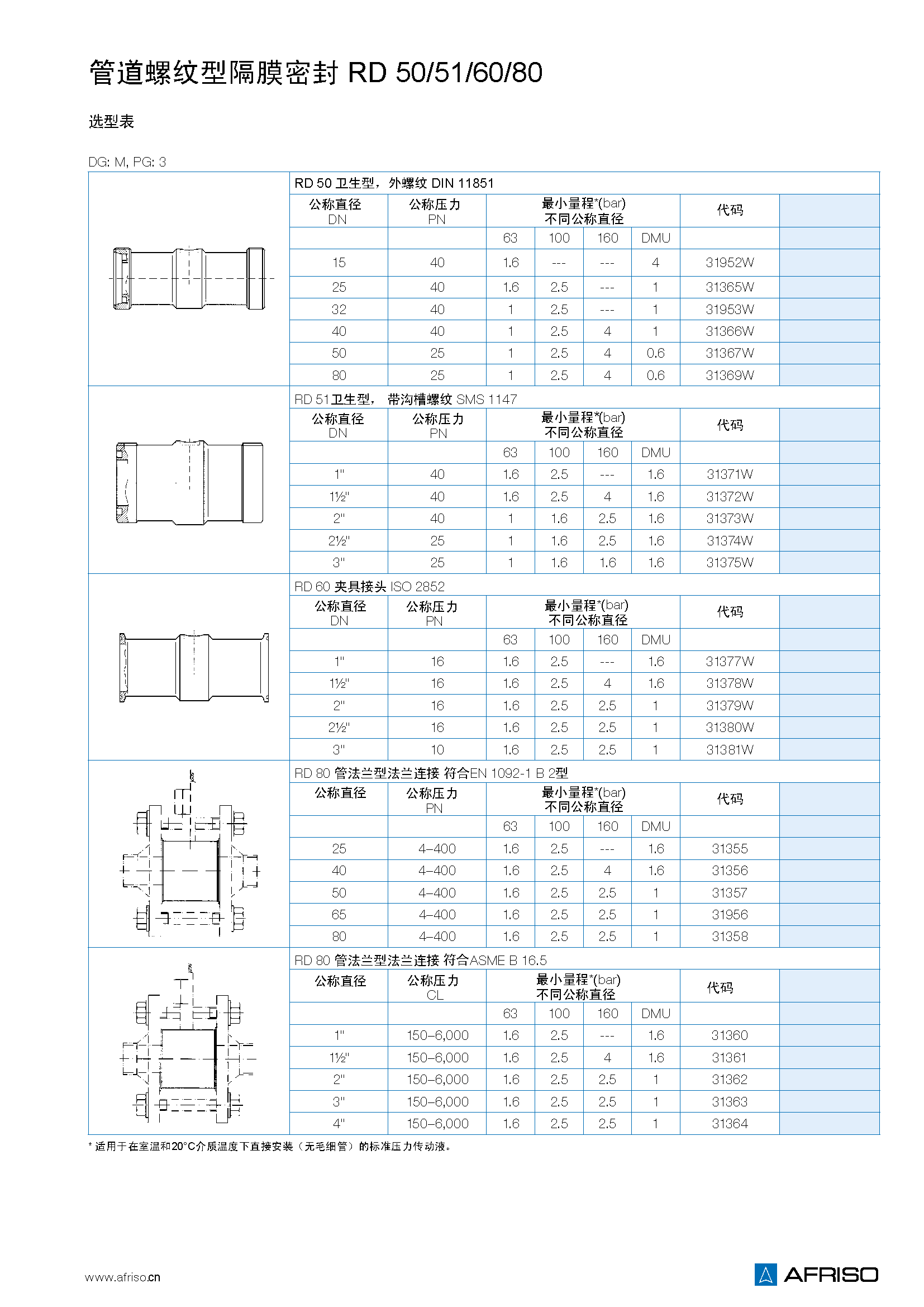 RD50:DIN 11851,316 L,外螺紋DN 15 到 DN 80 RD51:SMS 1147 1" 到 3" RD60:卡箍ISO 2852, 316 L 1" 到 3" |