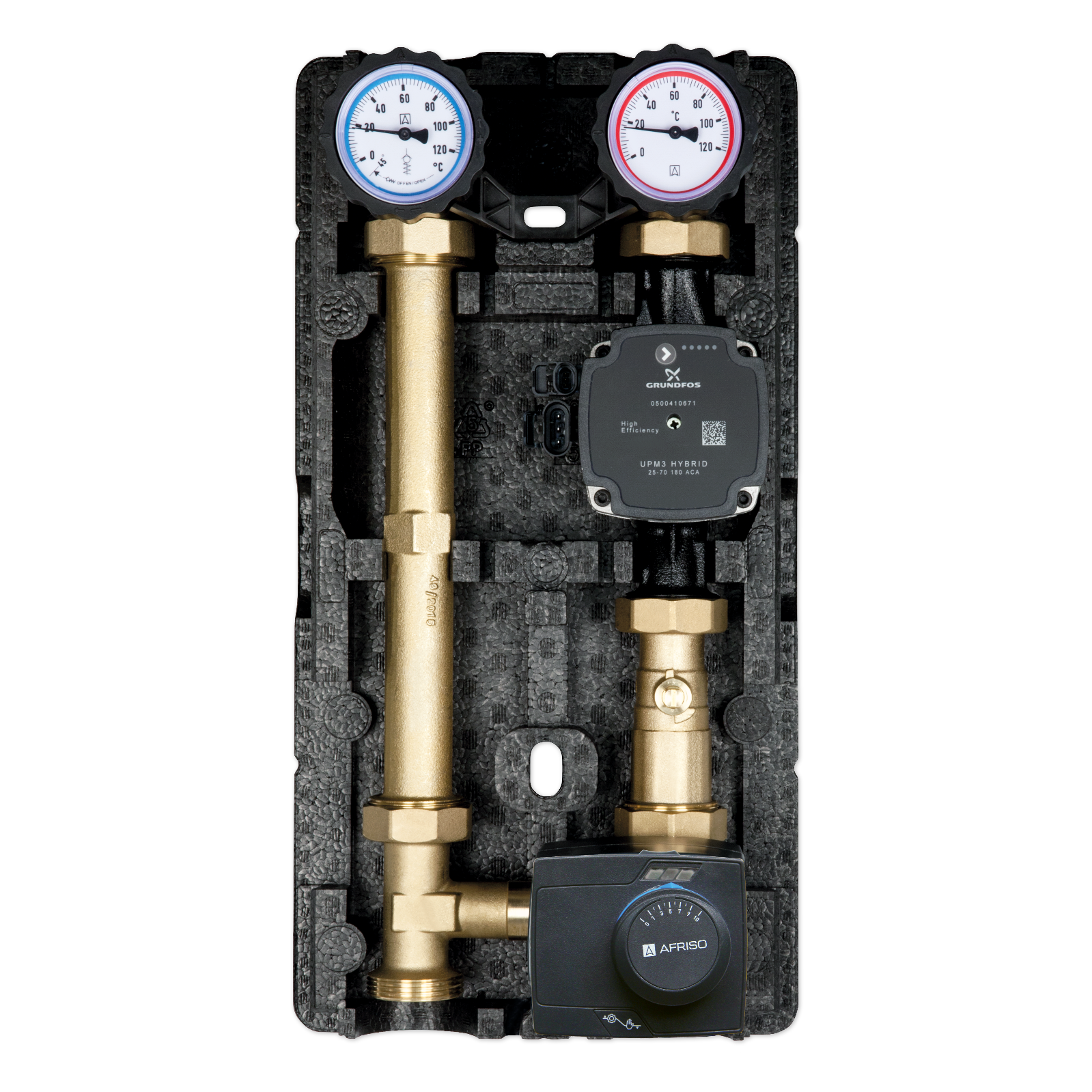 閥門帶溫度計、內置止回閥、高效節能循環泵、三通比例混水閥、電動執行器調節 |