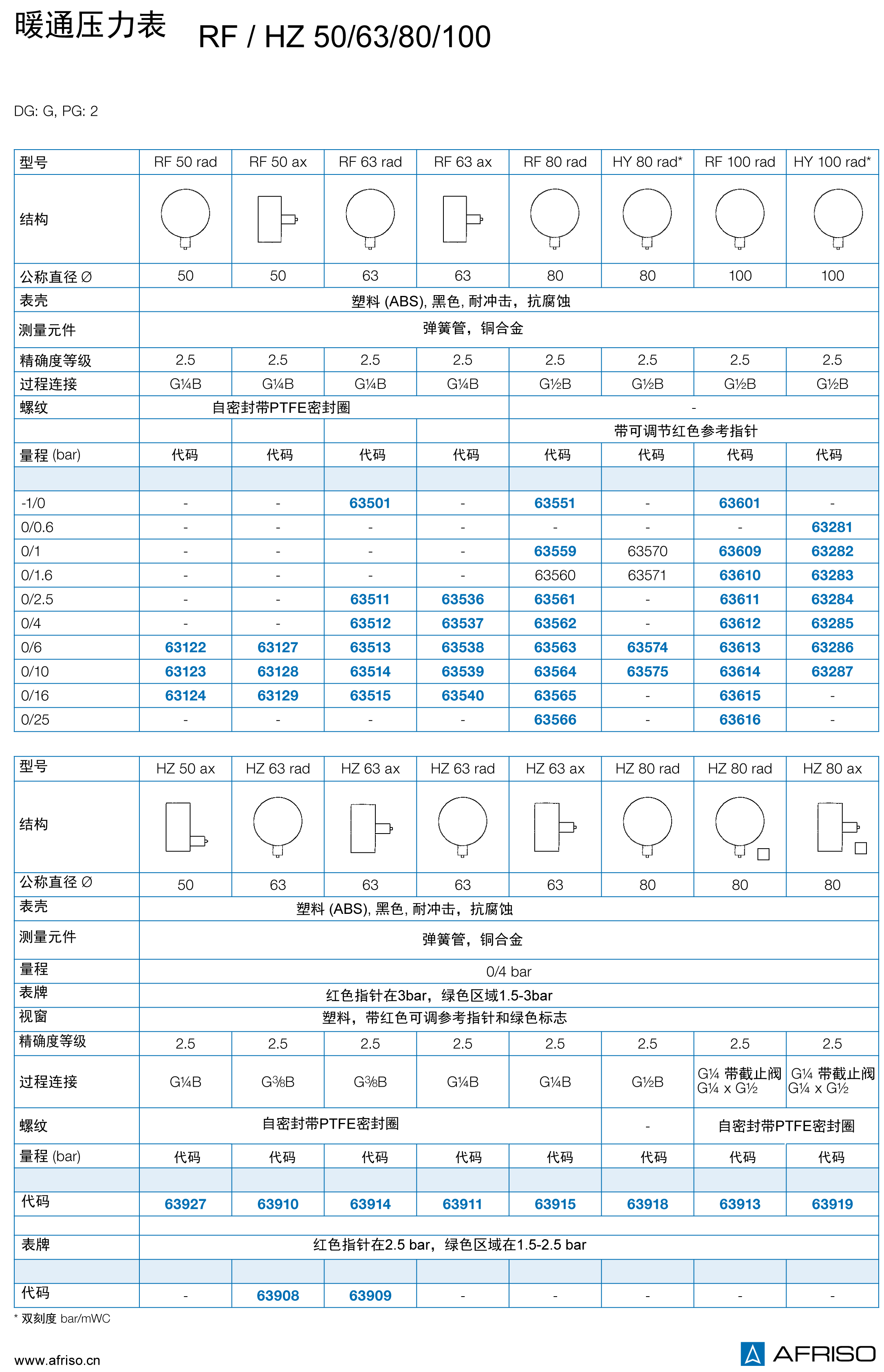 暖通壓力表NG 50-63-80 用于閉合供熱系統 范圍:0/0.4 MPa 過程連接:NG 50G?B軸向偏心; NG 63G?B或G3/8B軸向/徑向同心 NG 80G?B徑向或G?B軸向同心(帶G? x G?閥) 在刻度0.25MPa或0.3MPa處有紅色標記,0.15-0.25或0.3 MPa間有綠色扇形標識 儀表玻璃上印有紅色可調參考指針和綠色扇形標識