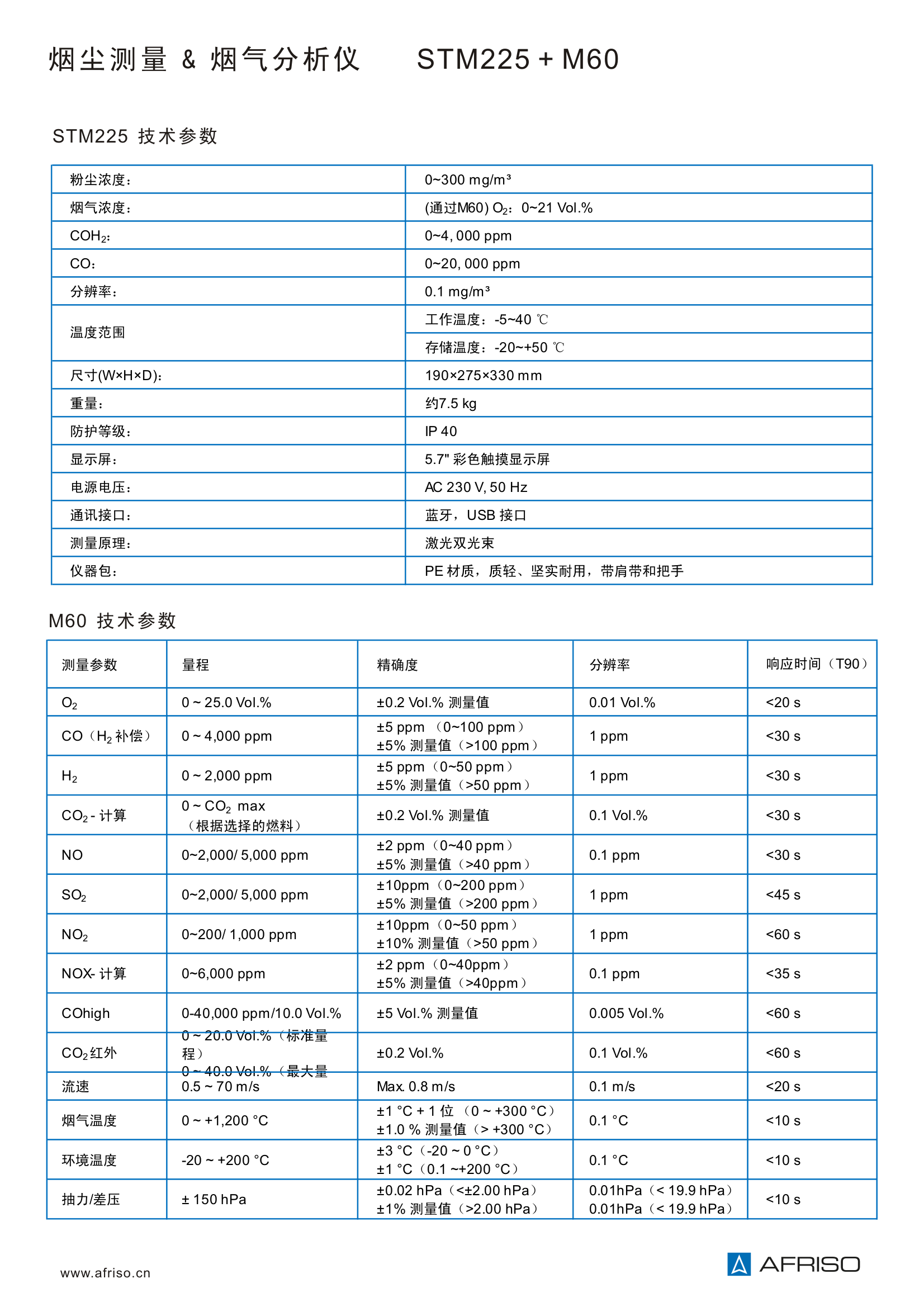STM225: ? 5.7" 高清顯示屏 , 觸屏操作模式 ? 激光雙光束測量原理 , 直接讀出煙氣中粉塵顆粒物濃度 , 快速簡便 ? 開機后預熱時間約 20 分鐘 , 自動執(zhí)行空氣中零點校準 ? 儀器持續(xù)測量15 分鐘 , 并實時顯示煙塵的濃度 ? 15 分鐘測量結(jié)束后 , 自動計算并顯示 15 分鐘平均值 , 以此作為該取樣點的煙塵濃度 ? 測量不受外界因素干擾(如震動 , 沖擊 , 海拔 , 溫濕度等) ? 通過藍牙實現(xiàn)與煙氣分析儀的同步測量 , 即同時測量煙氣和煙塵濃度 ? 使用成本低 , 維修簡便 M60: ? 中文彩屏,多種顯示格式:1行,4行或8行顯示 ? 標配長壽命化學傳感器,O2傳感器使用期≥5年 ? 內(nèi)置雙抽氣泵,帶反吹功能,保護CO/H2傳感器過載狀態(tài)下的安全 ? CO高量程傳感器,40000ppm和10%vol. ? 管路氣密性測試,壓力泄露(損失)測量,大氣壓測量 ? 標配低耗能藍牙通訊,藍牙打印和紅外打印功能 ? 可通過手機/Pad/電腦遠程監(jiān)控測量過程:顯示測量值的曲線圖和柱狀圖 ? 內(nèi)置二維碼功能,通過掃描二維碼后測量數(shù)據(jù)可直接保存于手機 ? 獨立的SD存儲卡,Max.32GB ? 選配:流速/流量測量功能 ? 選配:測量數(shù)據(jù)自動記錄功能,自定義記錄時間間隔1-999s ? 鋰電池巡航時間長達12h,測量過程中亦可同時充電 ? 預約關(guān)機及關(guān)機前自動沖洗功能 ?自動計算CO2,NOx,CO未稀 |