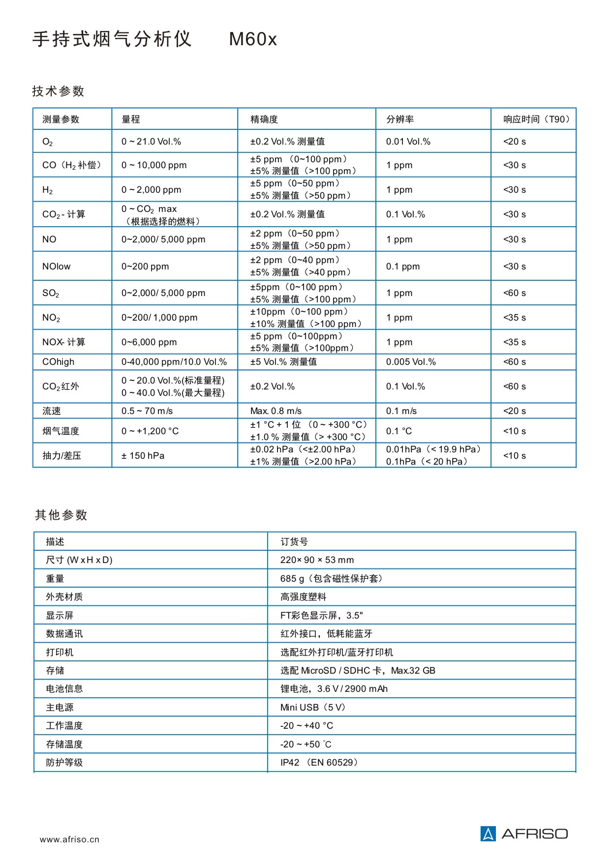 ? M60全新升級而來:新的操作按鍵設計和布局,實體按鍵,功能明確。傳感器精度和使用壽命更優; ? 標配長壽命電化學傳感器,O2傳感器使用壽命≥5年; ? 標配CO/H2高量程傳感器,實測量程達10000ppm,解決調試中因為超載造成的CO反復中毒問題; ? 內置雙抽氣泵,帶新鮮空氣反吹功能。確保CO傳感器在煙氣濃度超載的狀態下不會損壞 ; ? 標配測量數據自動記錄功能,記錄時間1~999s可調; ? 標配MicroSD卡4GB,最大可選32GB,用于實時的測量數據存儲和軟件升級; ? 儀器開機具備傳感器自動檢測及校零功能,傳感器響應時間極短,<20s,精度高,NOlow低氮測量,誤差≤2ppm; ? 可通過手機/pad/電腦遠程監控測量過程:顯示測量值的曲線圖和柱狀圖; ? 內置二維碼功能,每組測量值都能生成一個二維碼,通過掃描二維碼后可將數據直接保存于手機; ? 鋰電池續航時間長達12h,測量過程亦可同時充電; ? 自動計算參數:CO2 , NOx,CO(未稀釋) , 溫差 , 燃燒效率 , 過量空氣系數,煙氣損失值,露點; ? 品質可靠,100% 德國制造; |