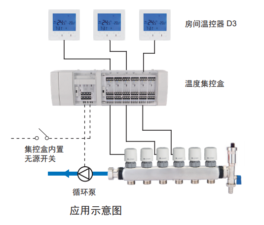在供熱采暖制冷系統中,與房間溫控器配合使用,用于控制熱源、循環泵或電熱執行器的啟停,達到舒適控溫的目的,減少能源耗費。 |